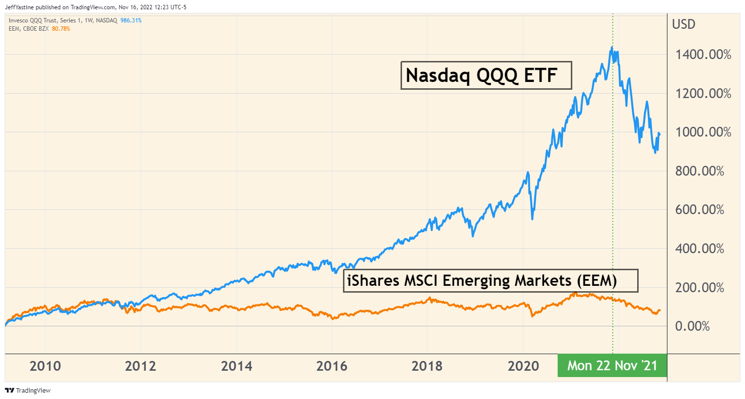 To put it all in context...US-based growth stocks - led by tech companies like Apple, Microsoft, Google and others - have massively outperformed over the past 10 years, while emerging market indexes have literally gone sideways and made barely any gains at all: