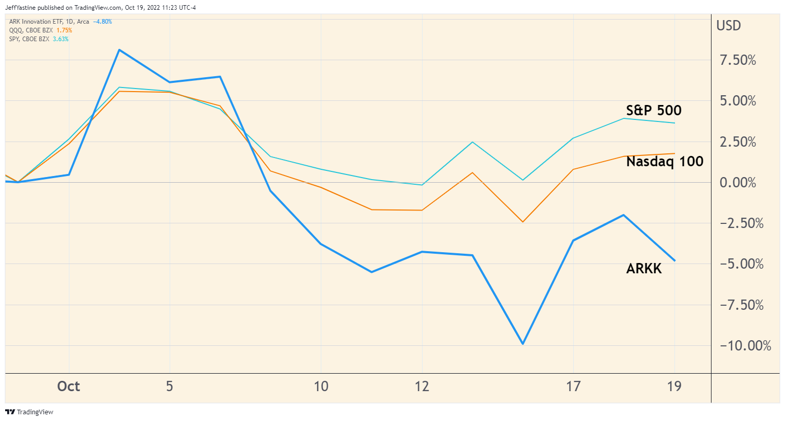 Since September 30, the S&P 500 and Nasdaq 100 indexes are 1.5% to 3.5% higher, while ARKK is down 5%: