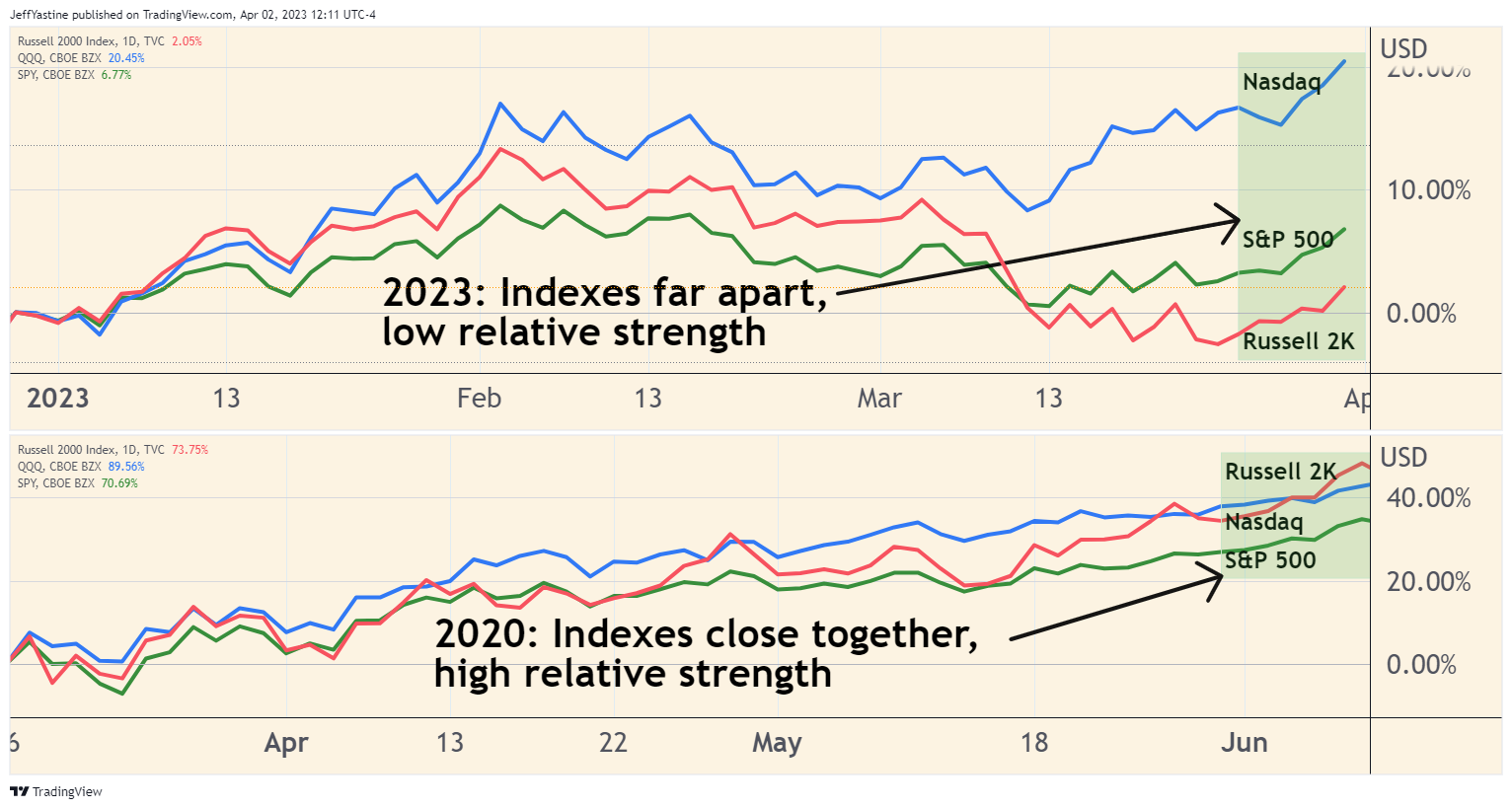 Here in 2023, the indexes are far apart. But in 2020, all 3 of the same indexes were ripping higher nearly in lockstep.