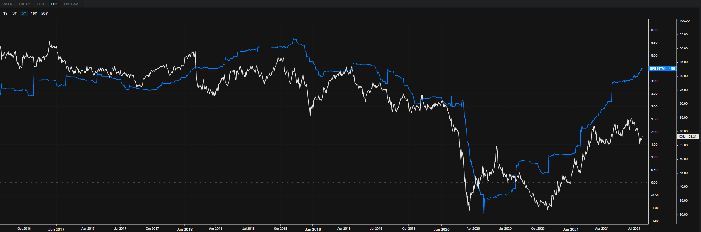 Yet the company's earnings per share (the blue line on the chart below) continues to rebound, and is now approaching its pre-pandemic levels.