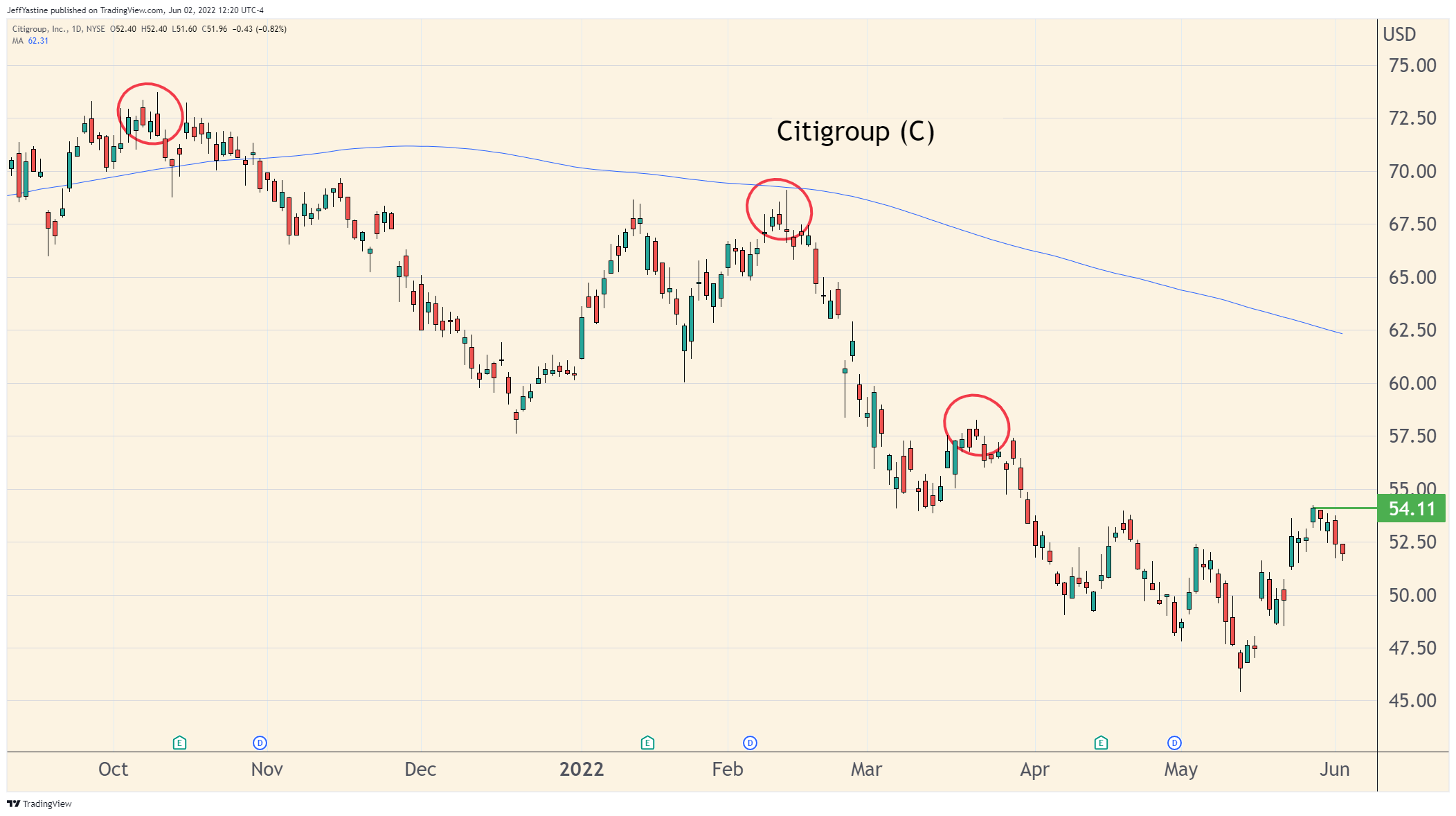 So I want to see a stock like Citigroup (C) (or really any large bank, for that matter) reverse course and at least poke its head up above last week's "market surge" high around $54, and above that, $58: